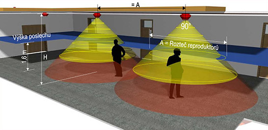 Návod, pomocí kterého určíte správný počet reproduktorů podle výšky stropu a povahy prostoru pro plošné ozvučení.