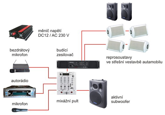 Prvním rozhodnutím, jež musí padnout je, zda ozvučení provedeme přímo na autobaterii, čemuž budeme muset uzpůsobit veškeré buzení, nebo zda ozvučení bude provedeno na 230 V, k čemuž bude zapotřebí tzv. měnič napětí, který 230 V vyrobí z 12 V autobaterie. V prvním případě vybíráme autozesilovače popř. aktivní reprosoustavy právě na 12 V a musíme podotknout, že tato varianta je opravdu mnohem složitější a vyžadující pečlivý výběr zesilovačů. Chyby jsou zde časté. V druhém případě, kterému jsou věnovány další řádky, je vše jednodušší a ozvučení se dá navrhnout variabilně. Bude to chtít ale již zmiňovaný měnič napětí (viz autodíly).