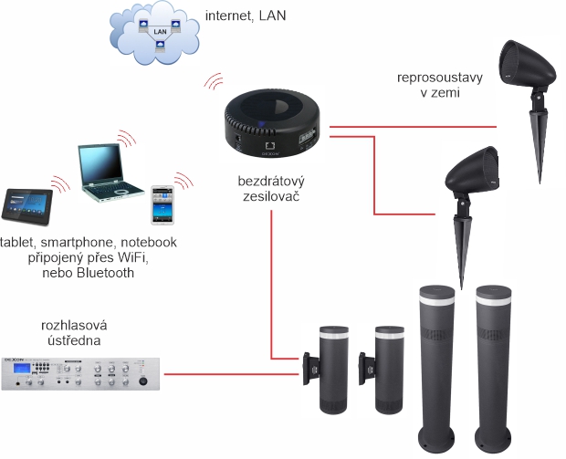 Máme dvě možnosti. Tou první je napojit ozvučení na zesilovač, receiver, či všeobecně řečeno na „domácí hifi aparaturu“. Je to sice levné, ale nepraktické a krkolomné. Ozvučení bychom museli ovládat doma a taktéž samotné zapojení by přineslo z elektrického hlediska obtíže. Elegantnější je, použít bezdrátový zesilovač. Modelů je hodně, my ale doporučujeme především JPM 2021 nebo JPM 2022WI. Malé kulaté krabičky, podobné puku, toho umí hodně. Zesilovač upevníme např. v altánku, pod stříškou, nebo na stěnu domu, přivedeme k němu napájení 230 V a propojíme s reproduktory (viz dále). To, co je podstatné, je, že již neřešíme propojení na zdroj hudby, nepotřebujeme žádný audio propoj do domu, nepotřebujeme propoj má mp3 přehrávač či rádio. Zesilovač je bezdrátový. Vychytávka je ta, že hudbu vysíláme přímo ze smartphonu, tabletu, notebooku nebo počítače.