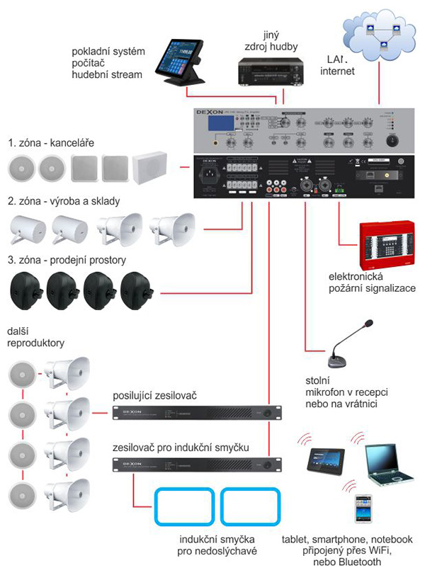 | Ozvučení výrobní firmy je realizováno prostřednictvím několika rozvaděčů, do jejich zesilovačů je audio distribuováno ve formě dat technologie Dexon IP audio. Jako reprosoustavy jsou zvoleny nástěnné typy řady SPT a reentrantní reproduktory SC. K vyhlašování je zvolen mikrofon PA 701. Ozvučení je napojeno na technologii výroby a je tak automatizováno. | |||