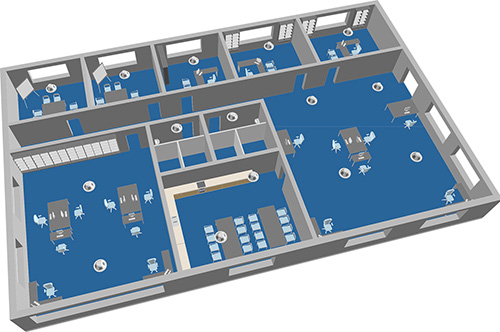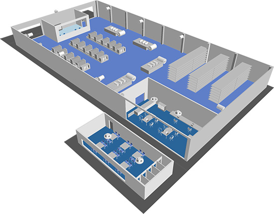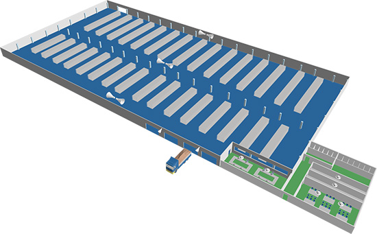 | Výrobní hala českého výrobce kosmetiky je ozvučená digitálním systémem IP audio prostřednictvím mnoha digitální reprosoustav, zesilovačů a podhledových reproduktorů. Systém je dále doplněn přepážkovým mikrofonem PA 701 a regulátory hlasitosti. | |||