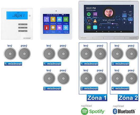 Existuje však nová, dovolíme si říci, přelomová, možnost. A ta je hlavně elegantní. Představte, si že vedle vypínačů na osvětlení instalujete další chytrou krabičku. Tou je tzv. nástěnný přehrávač se zesilovačem. Je to vlastně takové rádio do koupelny. Má v sobě přehrávač audia a videa, zesilovače, FM rádio nebo internetové rádio, většinou dotykový displej a hlavně spojení Bluetooth a na internet přes kabel nebo WiFi. Napájí se rovnou z 230 V, není potřeba žádný překážející adaptér. Předností nástěnných přehrávačů Dexon je jejich komfort a to, že v domácnosti nikde nic nepřekáží a hudba je vždy snadno dostupná, navíc i přes aplikaci v tabletu nebo smartphonu. A je dokonce možnost další nástěnné přehrávače instalovat do dalších místností v domě a následně je sloučit do multiroom režimu. Pak je ovládáme hromadně. Vše záleží na komfortu přehrávače, který si vyberete.