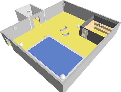 | Dva ozvučovací celky pro 1. a 2. nadzemní podlaží - prostory bazénu, masérny, koupele a dalších prostor je tvořen rozhlasovou ústřednou, podhledovými reproduktory v zónovém členění s důrazem na vlhkuodolnost repro. | |||