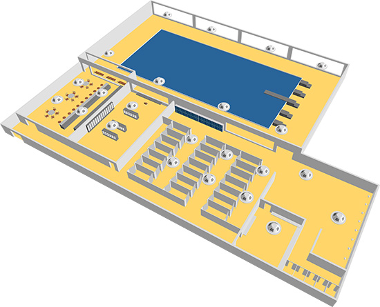 | Větší množství závěsných reproduktorů řady RPT xxxZ ozvučuje prostory sportovního centra, wellness a fitness. | |||