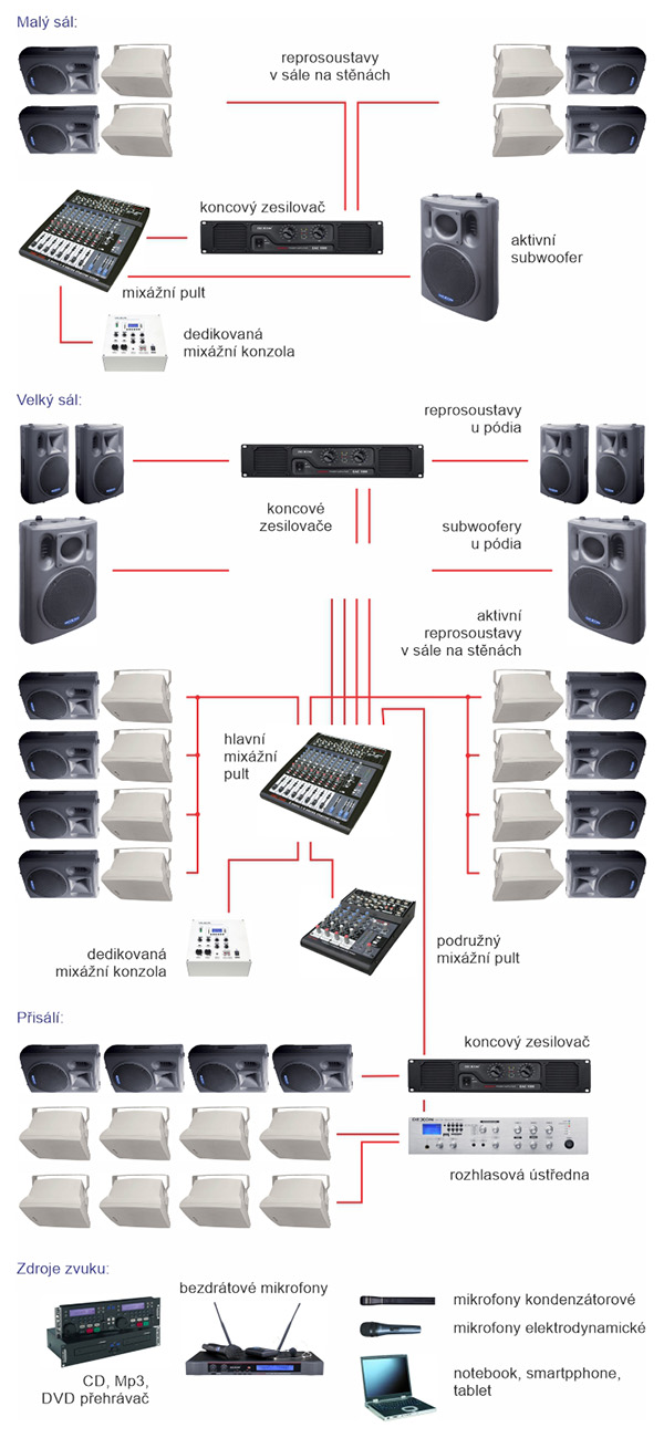 Kulturní dům, to není jenom velký sál, jak jej znáte. V případě větších staveb, jsou to také menší sály a přísálí. Proto tento návrh ozvučení rozdělíme na jednotlivé prostory. A toto rozdělení doporučujeme provést i fyzicky.