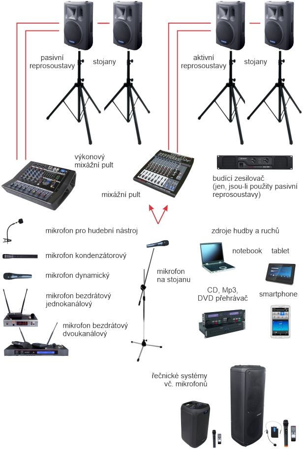 | Bezdrátové mikrofony, sejmutí jeviště, reprosoustavy |