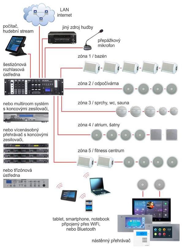 | Několikazónové ozvučení wellness prostor maticovým způsobem s lokálními ovládači pro výběr hudby, internetových rádií, podhledovými reproduktory a reprosoustavami | |||