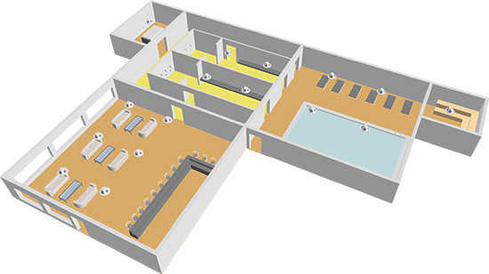 | Větší množství závěsných reproduktorů řady RPT xxxZ ozvučuje prostory sportovního centra, wellness a fitness. | |||