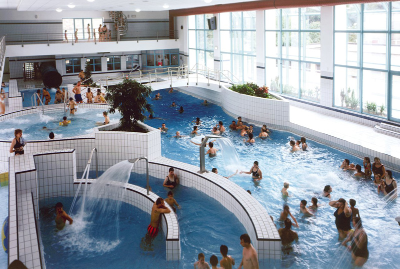 Bazén je místo s největší vlhkostí. Vybíráme reproduktory s patřičnou odolností na vlhkost, pozor také na korozi. Místo bazénu ve většině případů nemá žádný podhled, proto jsou nutné vlhkuodolné reprosoustavy, např. ty s konzolou SP 442, SP 642, SP 842, nebo SP 632, nebo SP 1032 nebo SP 402. Poslední jmenované vynikají nasměrováním zvuku do stran a tak ozvučí daleko větší plochu z jediného místa. V některých případech architekti volí i závěsné reprosoustavy. Ať už vyberete klasické „bedničky“ nebo závěsné typy, platí, že zásadně ozvučujeme místo kolem bazénu, tedy tam, kde jsou umístěná lehátka. Nabízí se také varianta ozvučení nad samotnou vodní plochou, to má ovšem tři nevýhody. Tou první je zvýšená vlhkost. Druhou je příliš vysoký strop, kdy zvuk by byl směrován z velké výšky oproti vodní hladině, od které se odrazí, a tudíž se stane nesrozumitelným. Třetí nevýhodou je, že ve vodě jsou návštěvníci (zejména děti) daleko hlučnější, takže nemá příliš smyslu tento povyk přehlušovat. Naopak v místech okolo bazénu snadno použijeme reprosoustavy níže na zdi, které nasměrujeme na místa s lehátky. Zde zvuk bude daleko příjemnější.