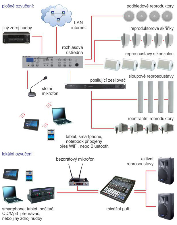 Lokální ozvučení má splnit účel mobilního ozvučení, např. pro vystoupení dětí, karnevaly, přehlídky a mnohé další. Jde o sestavu zdroj signálu – mixážní pult + zesilovač, nebo výkonový mixážní pult a reprosoustavy. Jako zdroj signálu používáme nejčastěji smartphone, nebo tablet, či profesionální CD přehrávač.. Ten je napojen buď na mixážní pult DMC 2220 a ten na zesilovač DAH 800, nebo rovnou na výkonový mixážní pult PMS xxx. Jako reprosoustavy jsou zvoleny profesionální, cenově přijatelné, BC 1000. Tuto sestavu nabízíme také v cenově zvýhodněném setu, kdy není použit zesilovač, ale rovnou aktivní verze reprosoustav.