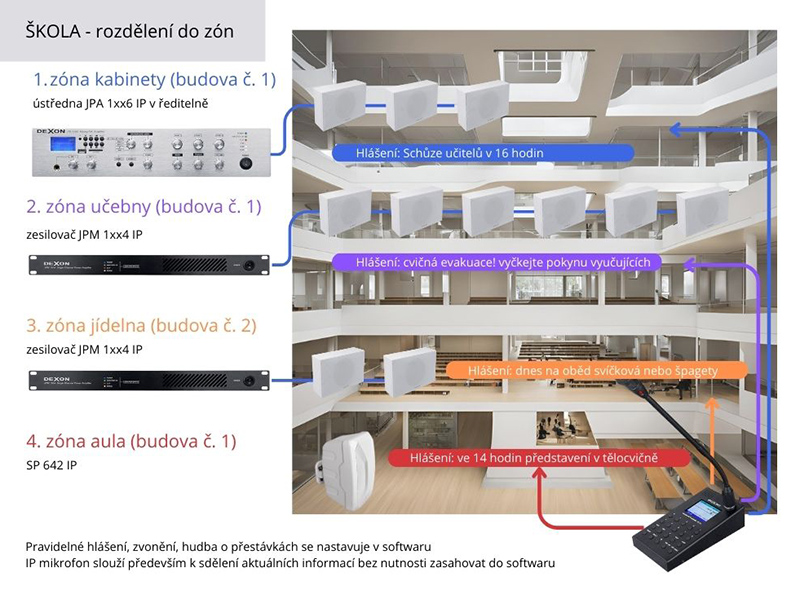 | Prostory školy jsou moderně ozvučeny větším počtem IP reprosoustav SP 512IP, které jsou zapojeny rovnou do LAN. Taktéž je zapojen mikrofon pro hlášení PA 701. | |||
