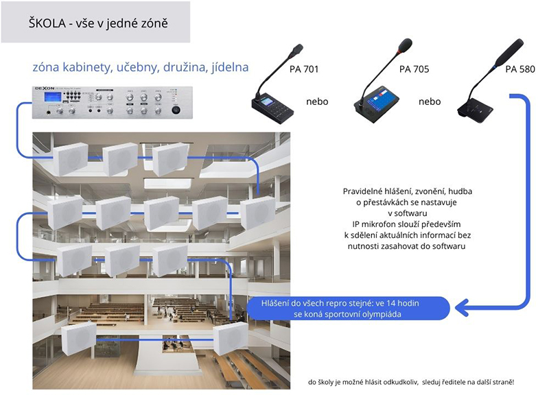 | Jednozónové ozvučení prostor školy pomocí technologie Dexon IP Audio je tvořeno digitálním zesilovačem o výkonu 900 W který budí nástěnné reprosoustavy ARS 321. | |||