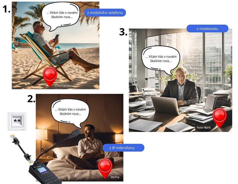 V počítačové síti nám běží jenom serverová aplikace a vybraný koncový zesilovač či ústředna je připojena do této sítě, jako běžný počítač. Pak už ve smartphonu, tabletu nebo notebooku, odkudkoli se světa, provádíme hlášení, spouštění hudby na pozadí, časové plánování zvonění, pozdravů, hlášek, hudby, alarmů a mnoho, mnoho dalšího, jak např. ukazujeme zde
