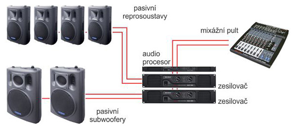 | Výkonová ozvučovací sestava s aktivními výkonovými reprosoustavami, mikrofony i mixážním pultem. Doplněna je kompletní kabeláž. | |||