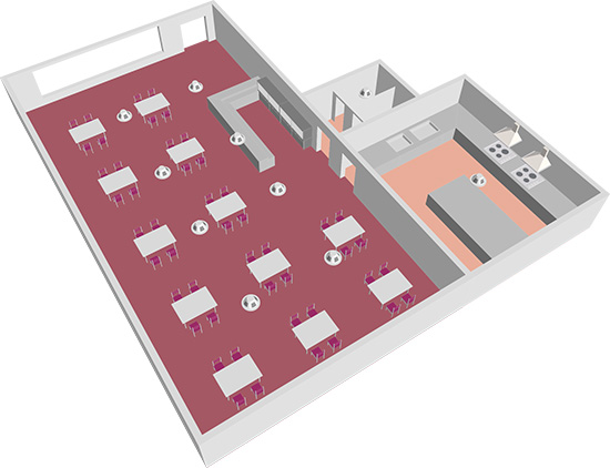 Šest reprosoustav SP 622 ozvučuje interiéry restaurace. Jako zdroj hudby je zvolena rozhlasová ústředna JPA 1504 s možností externího připojení dalších audio zdrojů.