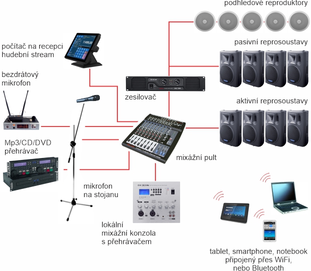Všechny zdroje signálů, jako je např. ozvučení prezentace z notebooku, signál z bezdrátového mikrofonu DEXON MBD 840, nebo klasického mikrofonu DEXON MD 510, ale také i signál z DVD přehrávače, jsou zavedeny do mixážního pultu. Ten nám instalační firma propojí, pro nás to jen znamená, že všechny hlasitosti budeme nastavovat právě na něm.