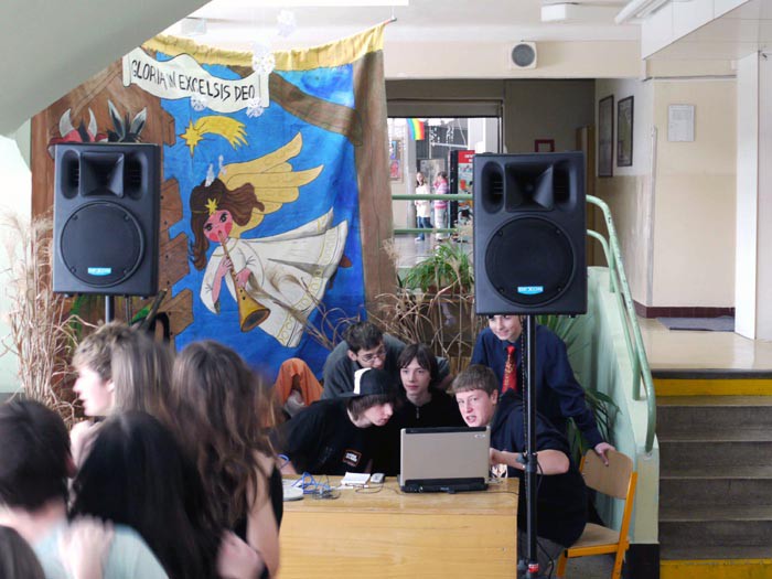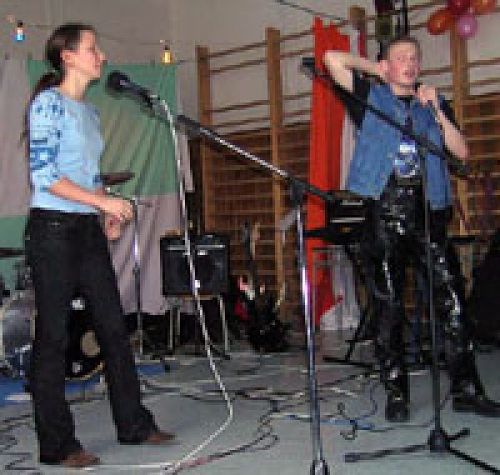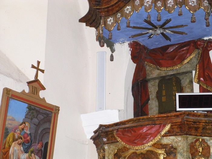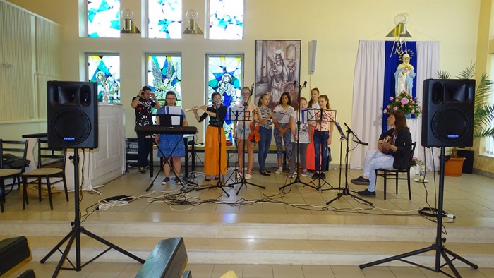 Ozvučení scholy v kostele reprosoustavami BC 1200A a mikrofony MD 505, MC 110