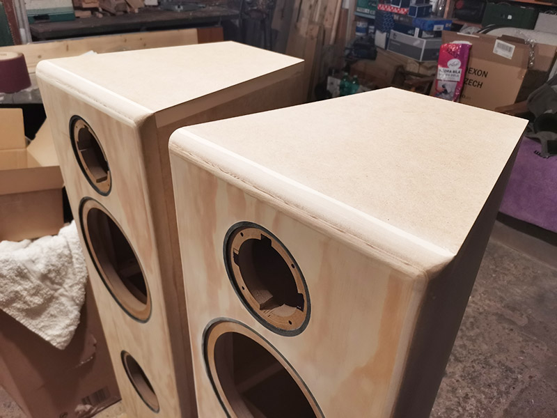 Dále jsem provedl 20mm zaoblení na přední straně pro snížení difrakce vysokých kmitočtů. Zadní stěna je nahusto přišroubovaná a utěsněná těsněním. Toto řešení jsem zvolil kvůli údržbě a i následným úpravám, které možná nikdy nepřijdou, ale co kdyby. Je to moje první stavba, a tak jsem si nechal prostor pro experimentování. Vše je k sobě slepeno a vyztuženo vnitřním „rámem“ a příčnými výztuhami, které jsou navíc zakolíkované.