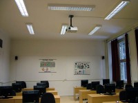 Přesto zasílám ukázku použití. Jde o počítačovou učebnu na pražském gymnáziu. Požadavkem zákazníka bylo do stávající učebny zakomponovat projektor a ozvučení.