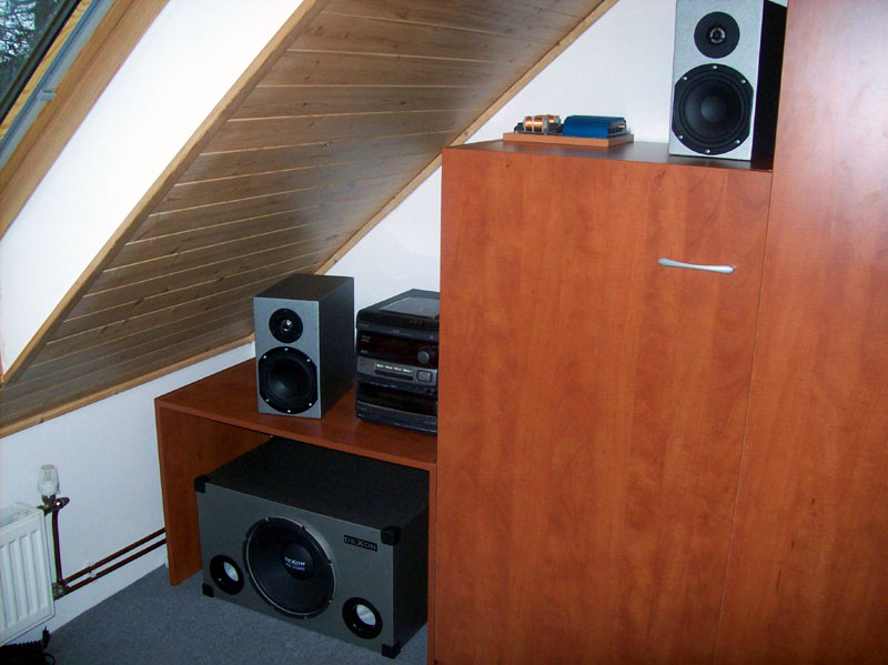 Ahoj, rád bych se pochlubil svými reproduktory postavenými podle lehce modifikované konstrukce firmy dexon. Všechny reprobedny jsou vyrobeny z 25 mm MDF desky. O povrchovou úpravu se postarala odborná firma. Reprosoustava je osazena basovými reproduktory Dexon HRB 16/60/02,8 a výškovými HRT 8/50/01,8. Později jsem soustavu doplnil o vynikající basový reproduktor WD 120 s ozvučnicí o objemu 70l. Dostatečný příkon celé soustavě zajišťuje věž Aiwa NSX-V900. Basový reproduktor časem doplním některým z vámi nabízených modulů zesilovačů.