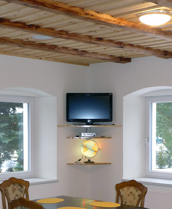 Máme ozvučenu hlavní místnost čtyřmi reproduktory RP 122 v restaurovaném dřevěném stropě domu z roku 1848. Rozvody 100 V systému jsou nataženy i na wc (RPT 82 s regulací hlasitosti PRT 300) a do koupelny (RPT 102 s regulací hlasitosti PRT 300). Zdroj zvuku distribuuje praktická ústředna šikovných rozměrů JPA 1032 se zabudovaným tunerem, možností přehrávání hudby z SD karty, USB či propojení přes Bluetooth.