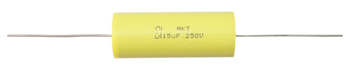 Kondenzátory z metalizované polyesterové fólie typu MKT. Axiální vývody jsou vyrobeny z měděného pocínovaného drátu, povrchová úprava žlutou polyesterovou páskou, čela zalita epoxidovou pryskyřicí, válcové provedení. Jmenovité napětí 250 V DC / 150 V AC, tolerance 5 %, maximální pracovní teplota 85 °C, ztrátový činitel tg δ < 0,01 / 1 kHz.