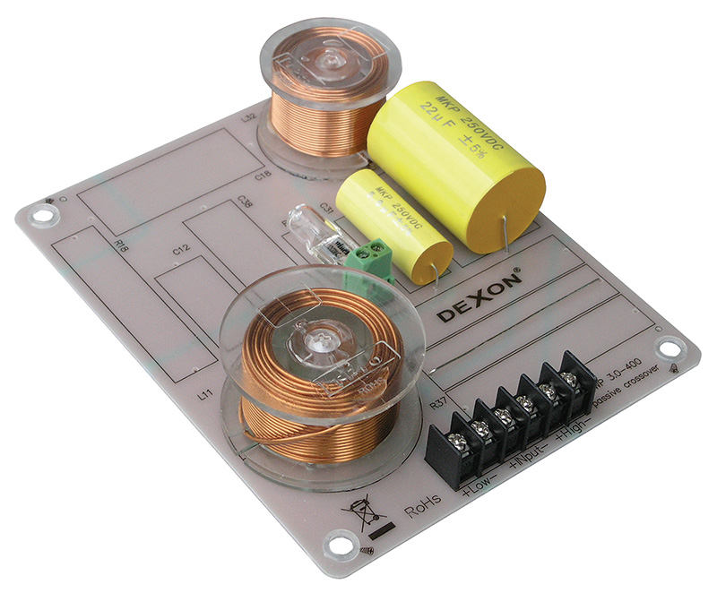 Stručný popis: 400 W, 8 Ω, 2 pásma, dělící frekvence 3 000 Hz, strmost 6 / 18 dB, volné pozice pro kompenzace impedance a útlum