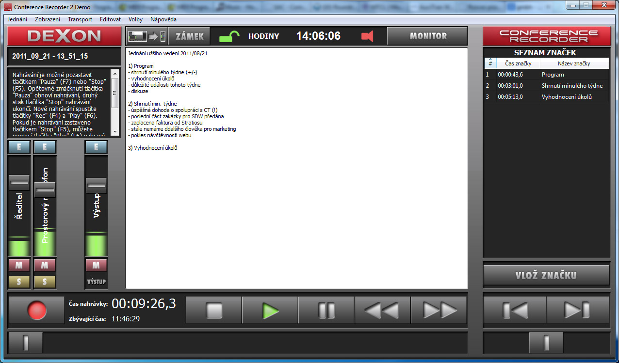 - v průběhu záznamu lze vkládat časové značky s textovou poznámkou. Tyto záložky umožňují snadno později nalézt a přesunout se na dané místo v záznamu. Mají také vliv na pozdější archivaci.