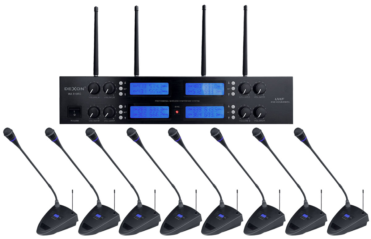 WA 510RC je diskuzním systémem, jež se skládá z hlavní přijímací stanice a osmi stolních bezdrátových mikrofonů v pásmu UHF. Vyniká především svou variabilitou a rychlostí zprovoznění. Nepoužívá žádnou kabeláž. Jsme si totiž vědomi toho, že existuje celá řada aplikací, kde diskuzní systém nesmí být instalován napevno a navíc, když už se zapojuje, tak pokaždé s jinou konfigurací. Tady to máme velice jednoduché: Pouze „rozhodíme“ mikrofony na stoly a zprovozníme přijímací stanici. Její výstupní sekce zahrnuje jednak separátní signály z jednotlivých mikrofonů, ale také i sloučený signál. všech mikrofonů dohromady. Je už pak na vás, zda výstupy napojíte na ozvučení nebo do nahrávacího zařízení, např. známého Dexon Conference Recorderu.