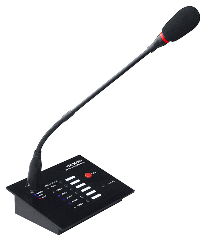 Stručný popis: lokální mikrofon pro hlášení, volba z 6 zón, Aux vstup, indikace napájení, připojení, zaneprázdnění a volby zón, automatické utlumení domovské zóny, elektretový mikrofon na husím krku, spojení s ústřednou přes UTP
