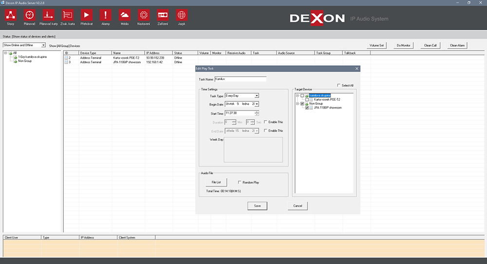 • Mozkem systému je Dexon IP Audio Server – propracovaná řídící administrátorská stále běžící aplikace.