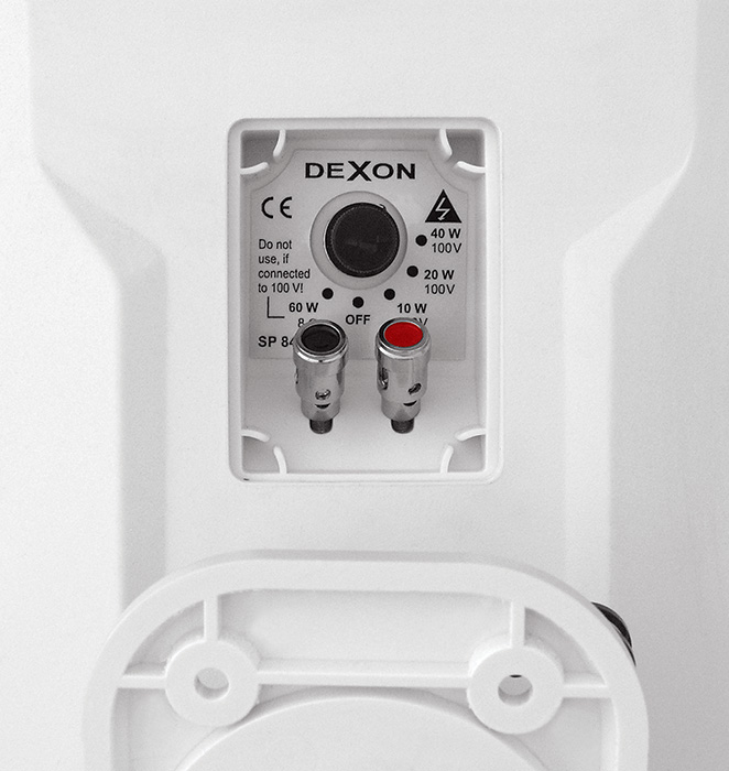 Připojení reprosoustav je možné ve vysokoimpedančním režimu (100 V), nebo v nízkoimpedančním režimu (8 Ω). Na to je určen přepínač výkonu (a tedy i hlasitosti) nad připojovacím terminálem. Dobrou vychytávkou je, že reprosoustavy dokážeme i zcela vypnout. Připojovací terminál a přepínač je proti vodě chráněn gumovou krytkou.