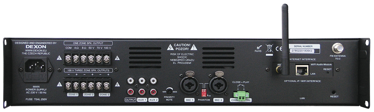 Stručný popis: 2 line + 3 mic vstupy, 3 zóny, 180 W, priorita, přehrávač MP3, SD + USB čtečka, FM rádio, DAB+ rádio, Bluetooth, audio modul pro gongy a hlášení, IR dálkové ovládání, technologie Smart Audio: WiFi, LAN, internetová rádia, přehrávání z lokální sítě, z internetu, smartphonu, tabletu, počítače, DLNA, AirPlay, UpnP, Spotify, Tune-In, I-Heart Radio, Napster, Deezer, streamovací aplikace jakékoliv a zdarma, vysoká účinnost, kvalitní zvuk. Využijte komfortu internetových rádií! Nyní také s DAB+ rádiem!