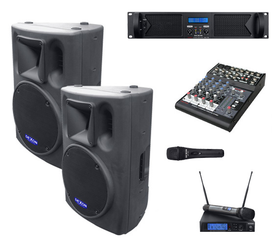 Stručný popis: dvě pasivní reprosoustavy, 2×300W / 121 dB, zesilovač, ruční mikrofon, ruční bezdrátový mikrofon, mixážní pult, kabeláž.