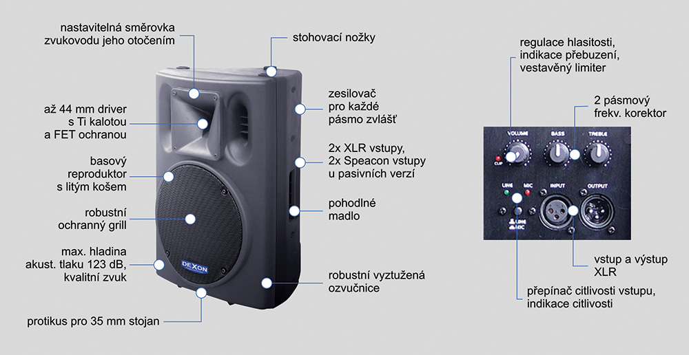 Stručný popis: 120 / 200 W, 113 dB SPL max., 60 – 20 000 Hz, 8″ bas. rep., 25 mm driver, aktivní. Robustní s vysokou citlivostí a hlavně spolehlivá!